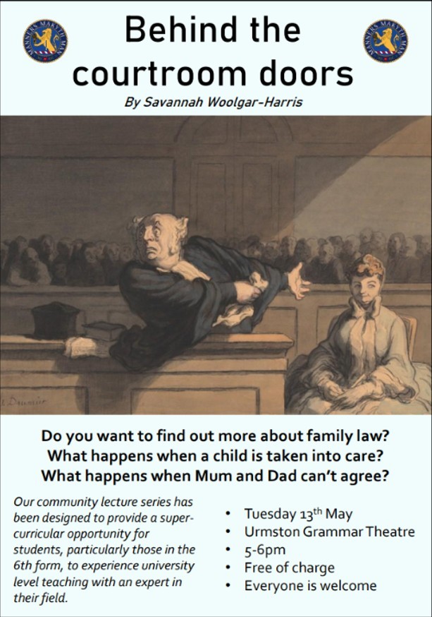 The lecture is entitled 'Behind the Courtroom Doors' and Savannah will present on elements of family law, such as what happens when a child is taken into care.
